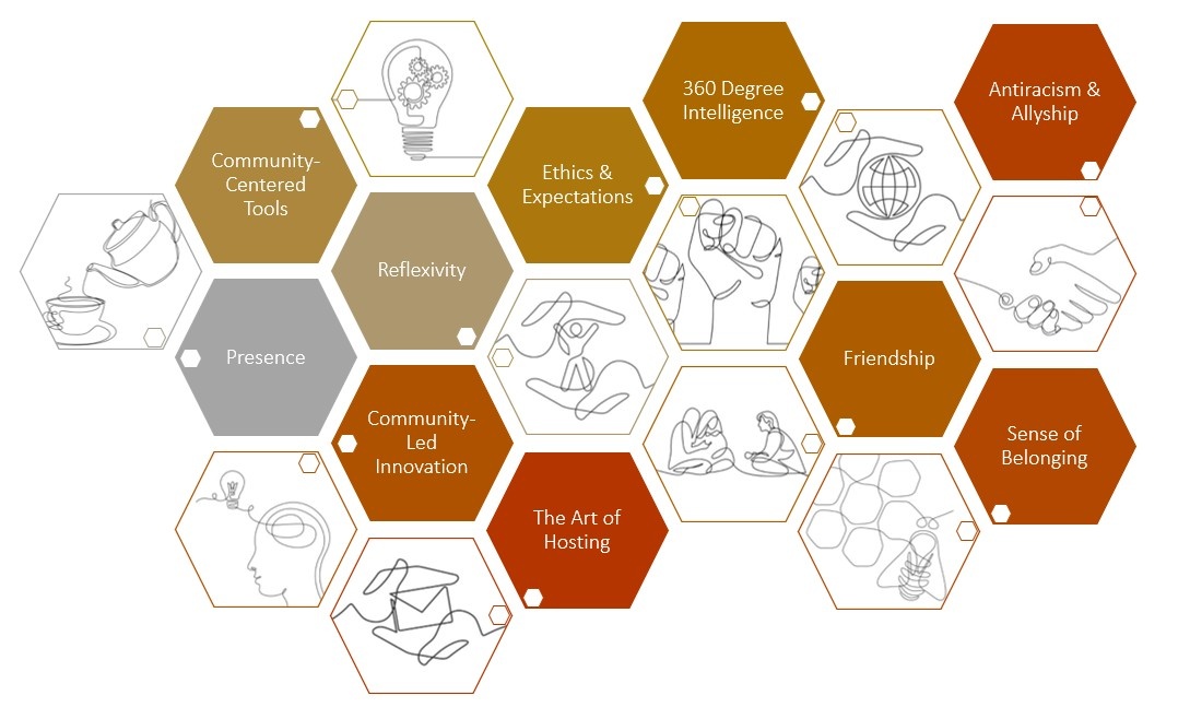 The Center for Authentic Community Engagement develops trainings that combine theory, practice, and real-world tools for immediate application. For a national health institution, the Center designed a 3-part online series, Engaging the Wisdom of Veterans, based on the 11 Liberating Practices of Authentic Engagement. The course blended self-paced modules with live office hours and interactive facilitation sessions, supported by curated workbooks, worksheets, and resource guides. Content ranged from facilitation basics (agenda design, ground rules, simple network analysis) to advanced practices such as recognizing group dynamics and uncovering hidden cultural norms. The training continues to spark results long after completion — participants often share how they’ve successfully facilitated new kinds of conversations using the tools and practices learned.